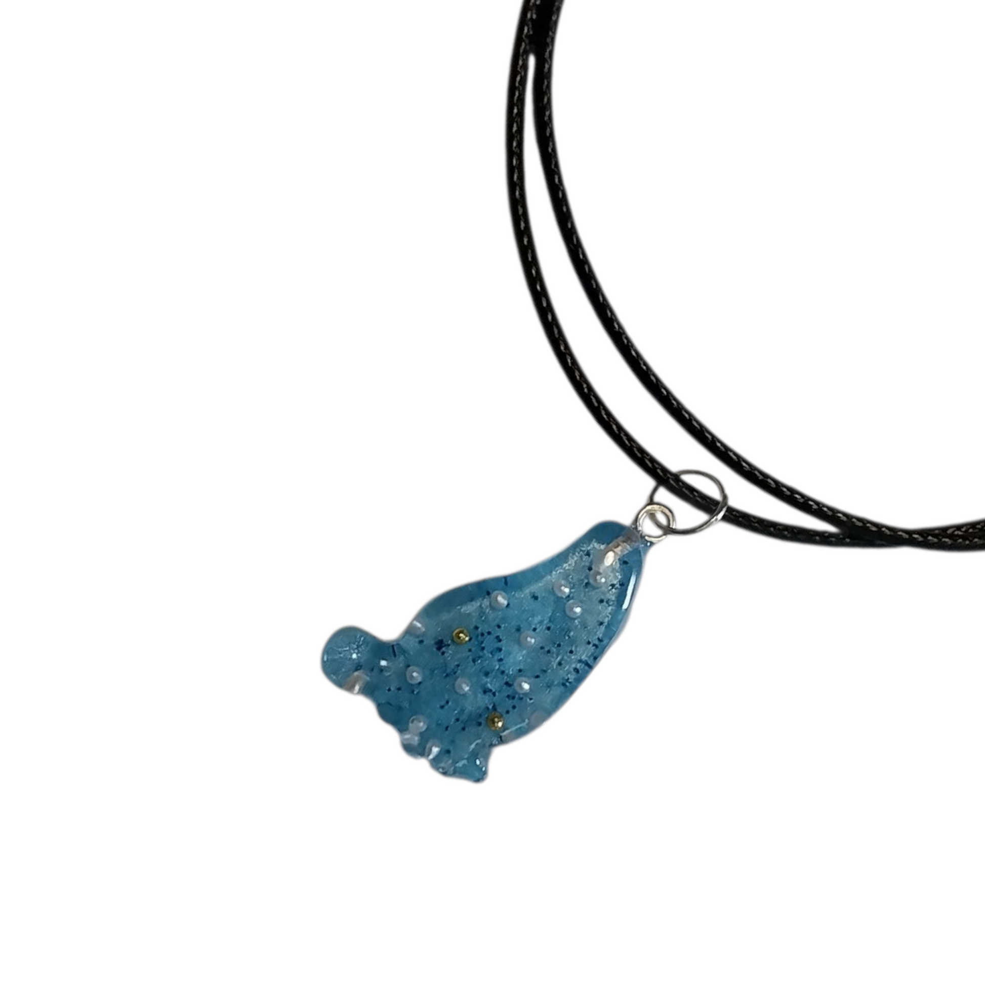 Baby nogica modre barve 2,8cm. Na povoščeni črni ogrlici. 45cm+5cm.