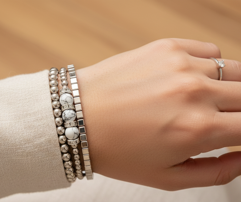 Velikost: Univerzalna (uni), kar omogoča udobno nošenje na različnih zapestjih, saj so kroglice nanizane na elastično vrvico 2 kosa, zapestnica s kamni pa je na pripenjanje s podaljškom.