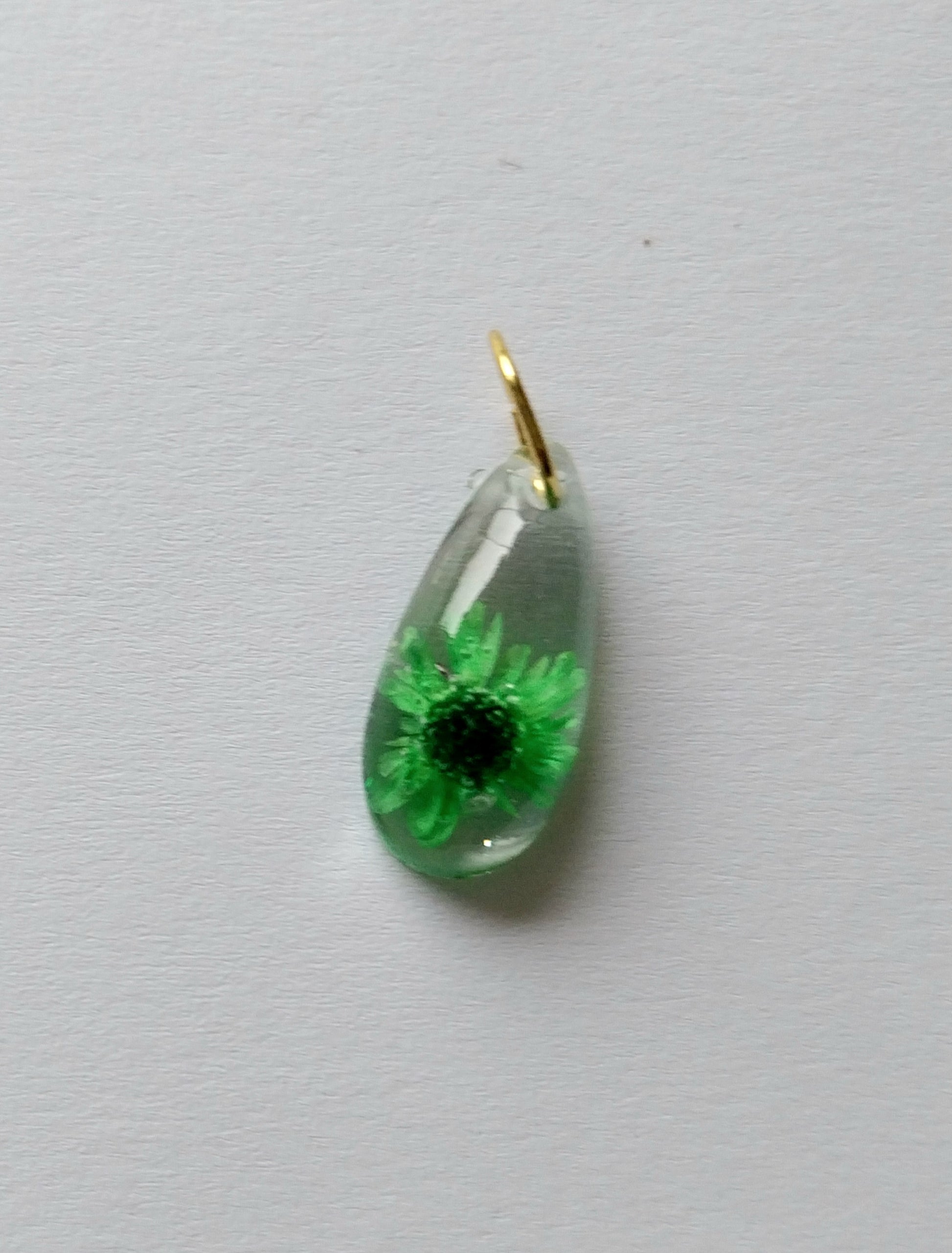 Obesek kapljica s pravim suhim cvetom, velikost obeska 2,2cm, barva cveta zelena.