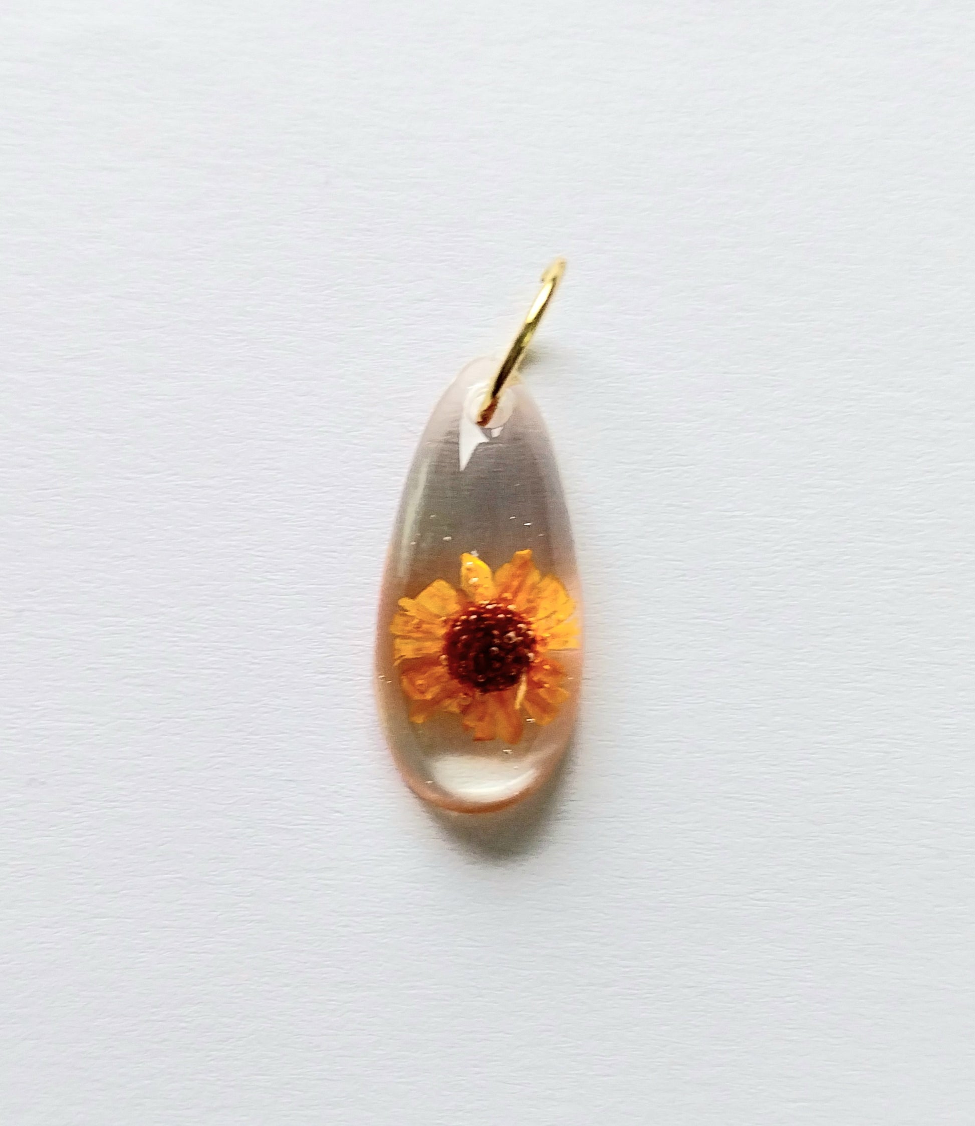 Obesek kapljica s pravim suhim cvetom, velikost obeska 2,2cm, barva cveta oranžna.