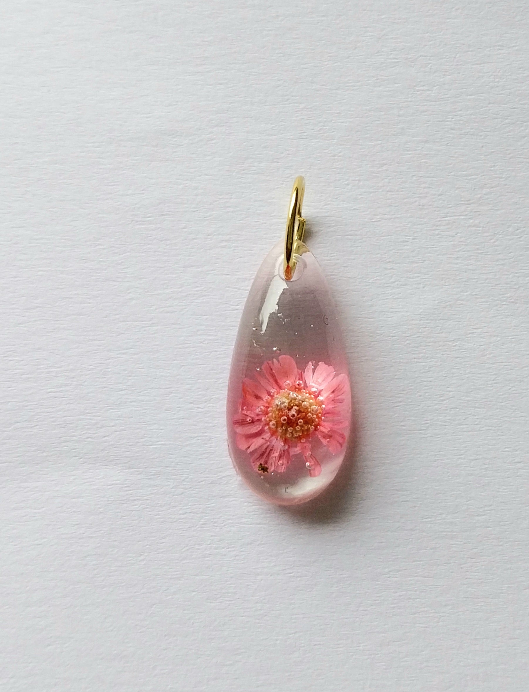 Obesek kapljica s pravim suhim cvetom, velikost obeska 2,2cm, barva cveta roza.