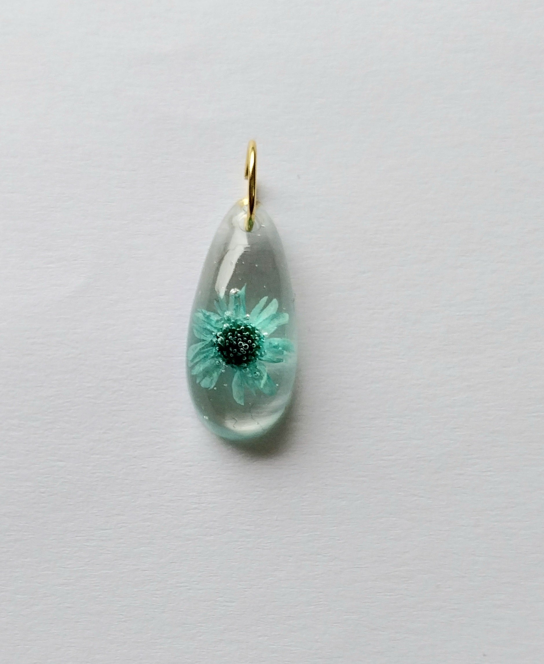 Obesek kapljica s pravim suhim cvetom, velikost obeska 2,2cm, barva cveta turkizno modra.