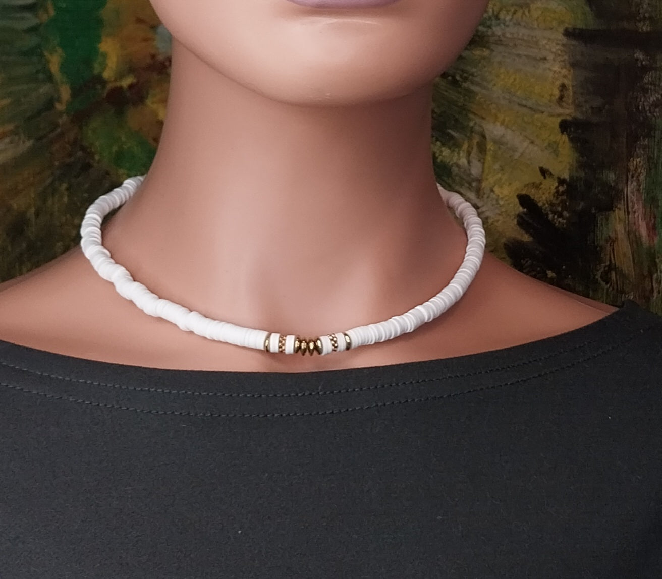 Dolžina nastavljiva 45cm+6cm. Material zlitina, mehke glinene perle in klasične perle. Odlična za layering , nanašanje nakita. Kombinirate jo lahko z zlatimi verižicami.