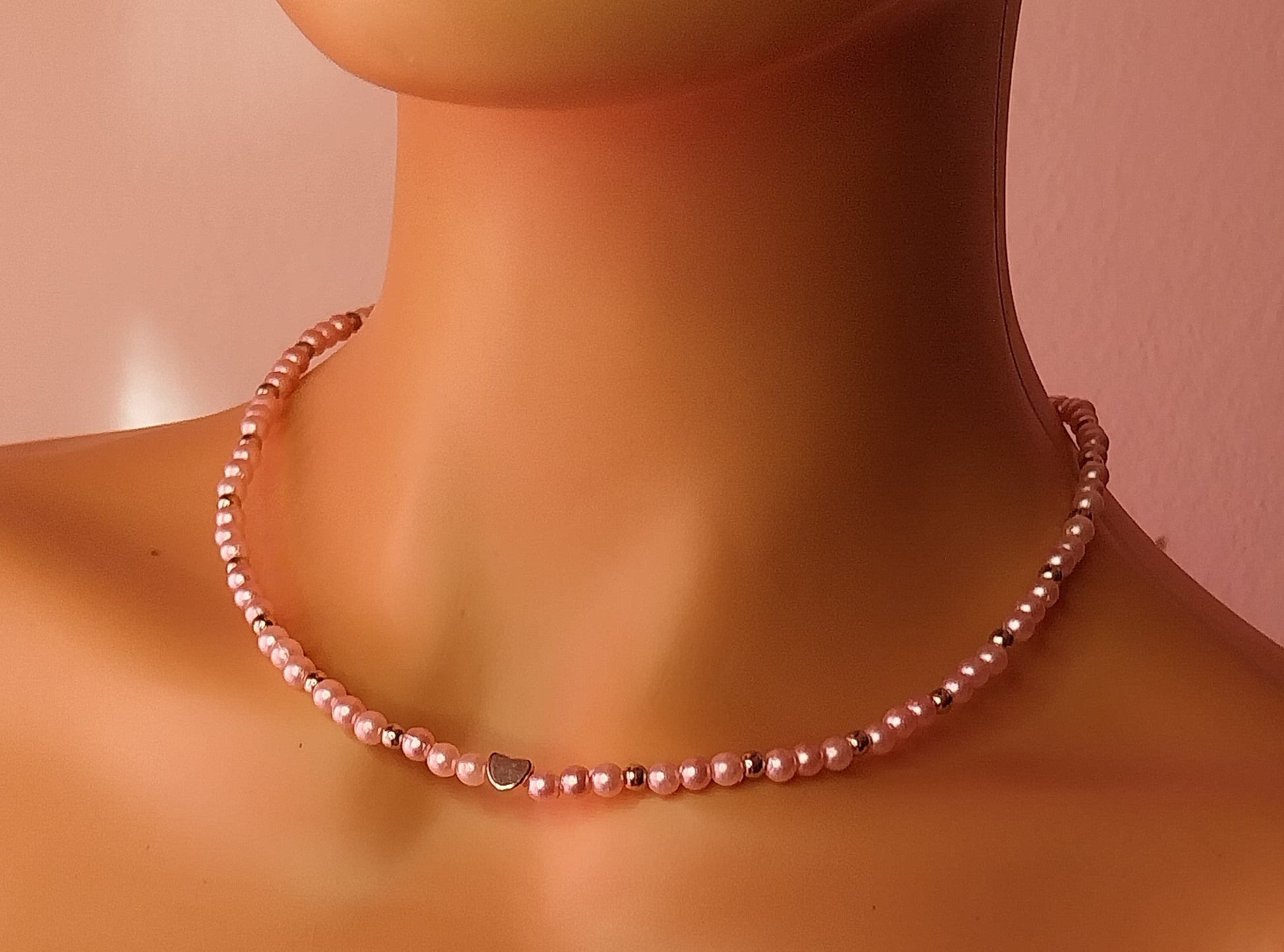 Roza ogrlica 50cm, umetne roza perle in srebrne kovinske perle, obesek srce.