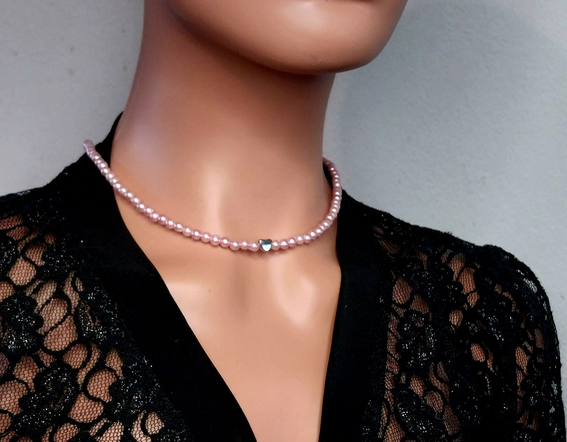 Ogrlica 50cm, umetne perle in obesek srcek iz zlitine. Primerna za nošenje samostojno ali v kombinaciji z srebrnimi verižicami.