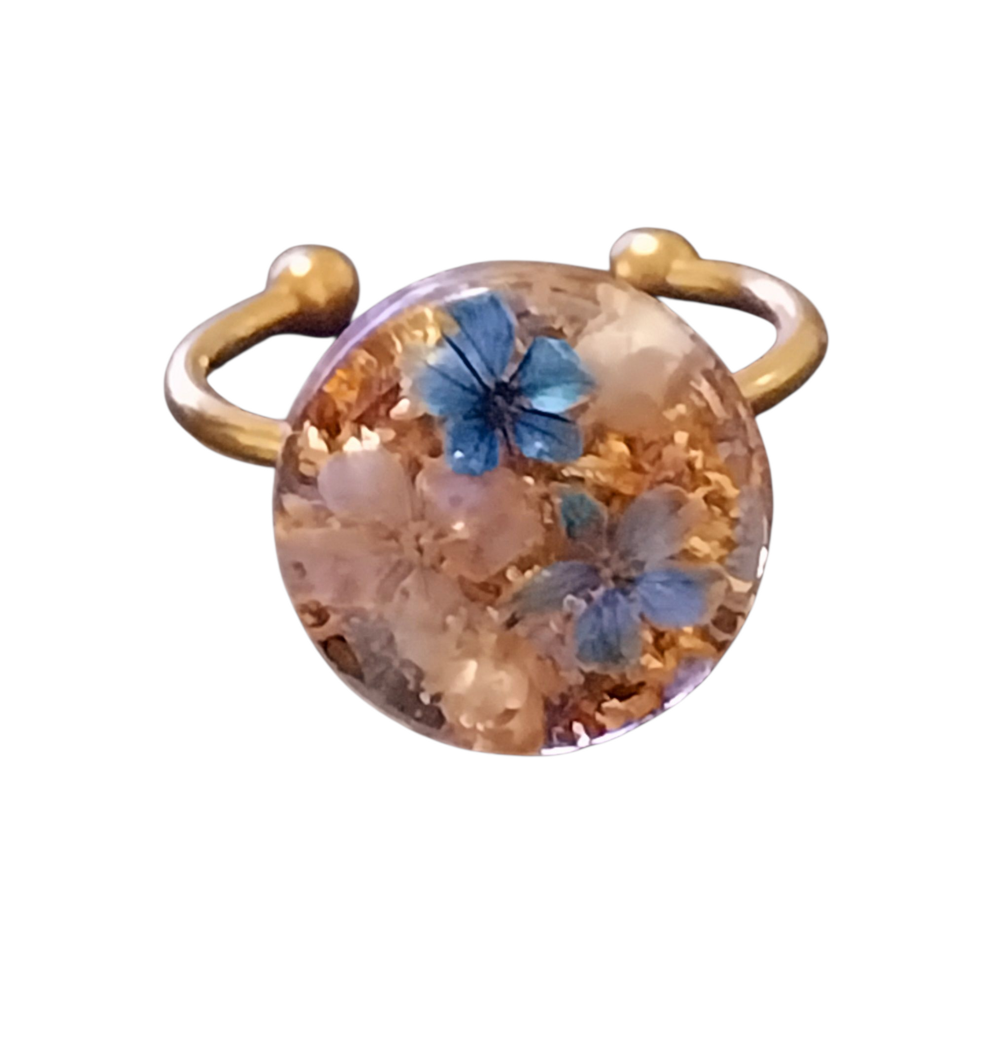 Ta edinstven in eleganten prstan združuje sodoben dizajn in naravno lepoto ali pa bleščečo domišljijo, ujeto v kristalno čisto epoksi smolo.
