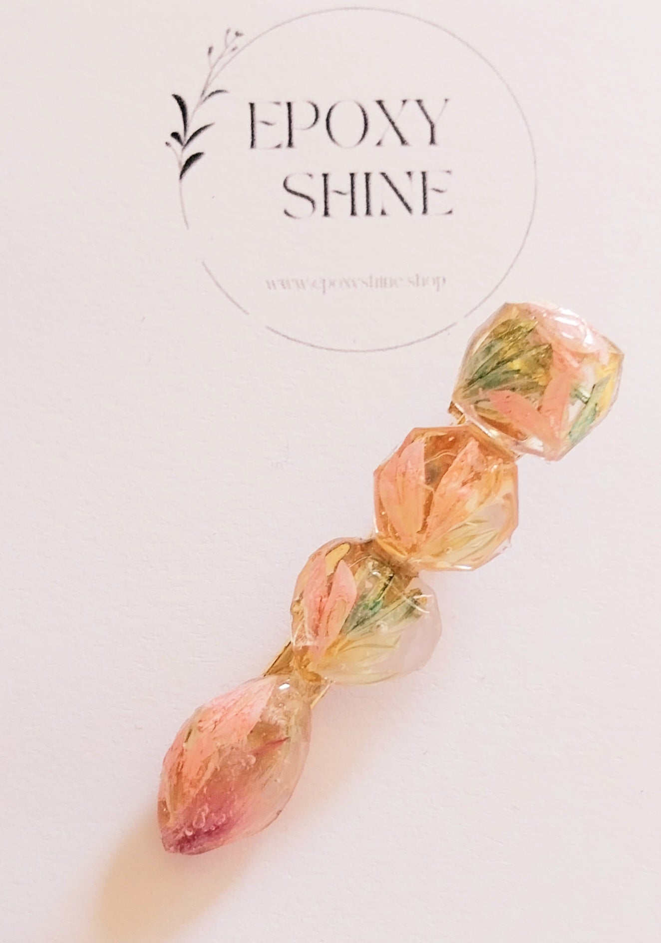 Dodaj kanček romantike svoji pričeski s čudovito ročno izdelano epoksi špangico. Vsaka sponka je unikat – ujeta kapljica elegance, ki nežno objame tvoje lase in jih popestri s subtilnim sijajem. Z dolžino cca 7 cm je popolna za vsakdanji videz ali posebne priložnosti, ko želiš zasijati.