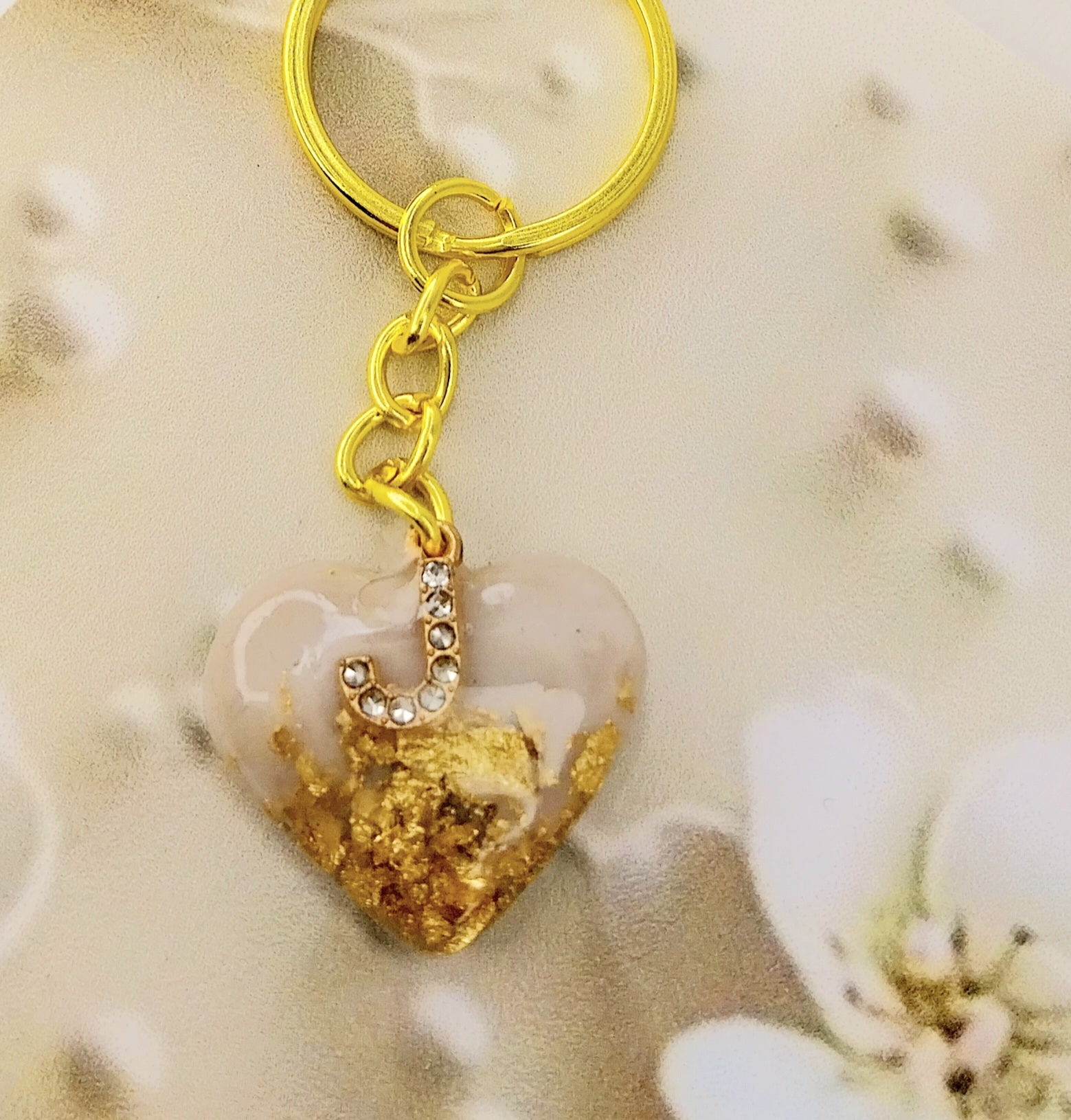 Dodajte pridih elegance svojim ključem ali torbici s tem čudovitim epoksi obeskom v obliki srca. Vsak obesek je ročno izdelan in vsebuje začetnico po vaši izbiri v prefinjeni zlati barvi, obogateno s kristalčki, ki mu dodajo kanček luksuza.