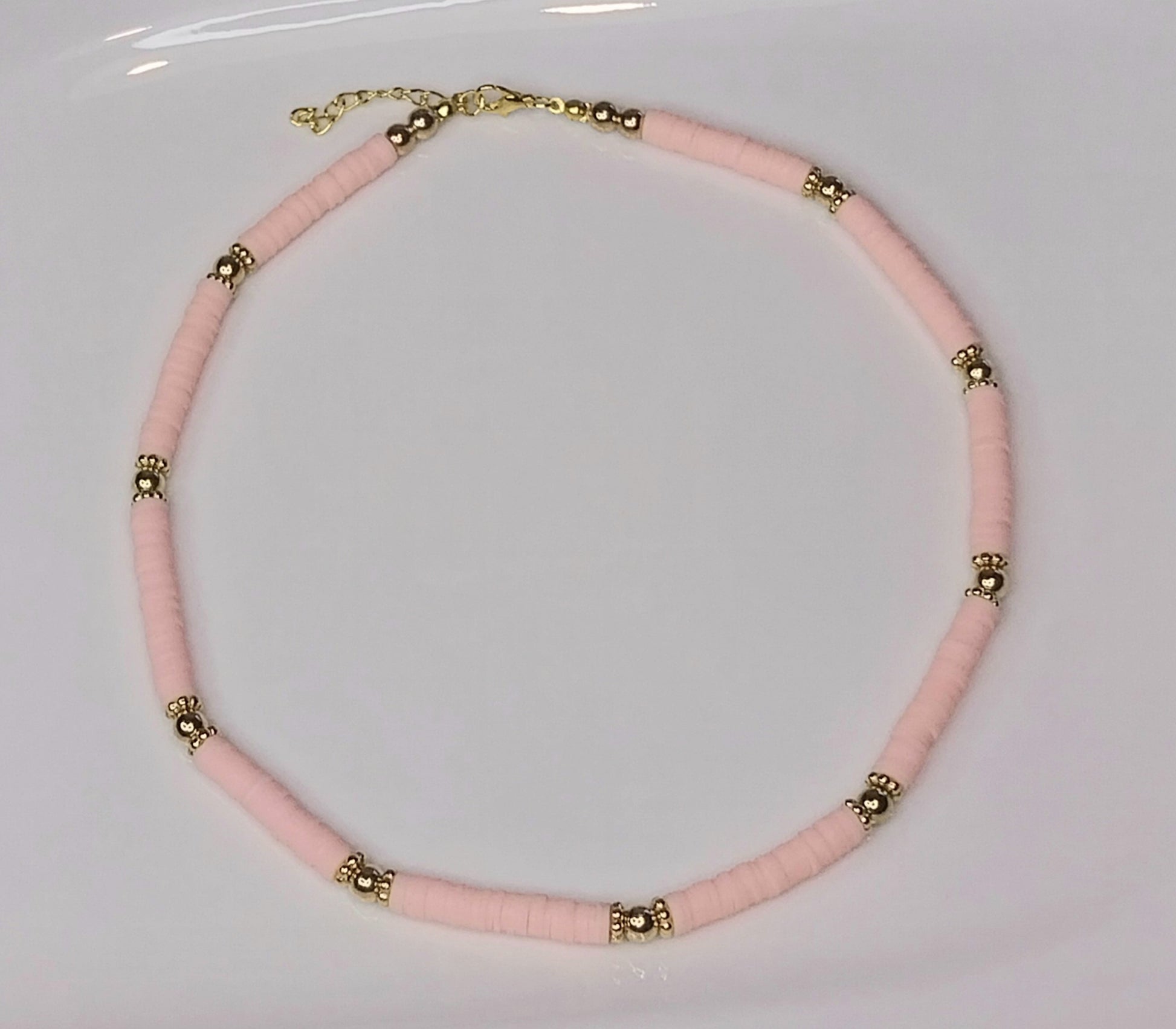 Dolžina nastavljiva 45cm+6cm. Material zlitina, mehke glinene perle in klasične perle. Odlična za layering , nanašanje nakita. Kombinirate jo lahko z zlatimi verižicami.Barva nežno roza.