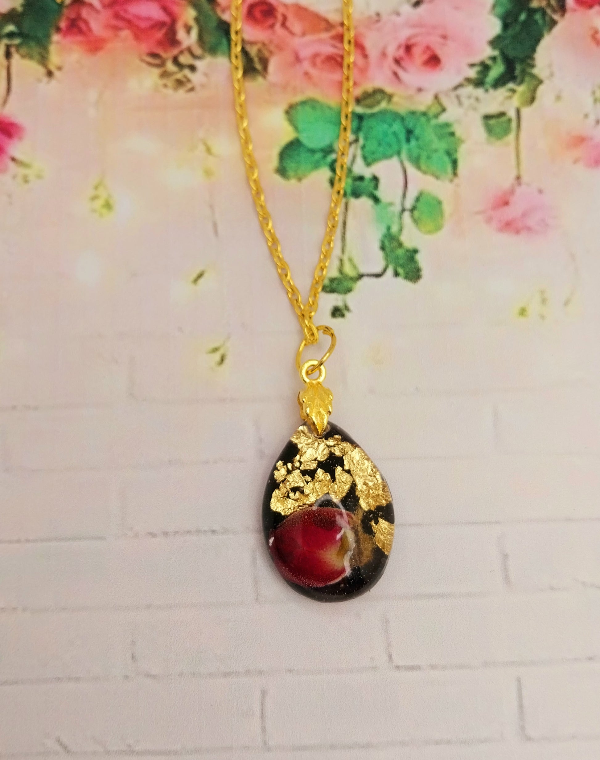 - Material: Epoksi smola, naravni popek vrtnice, kovinska zlitina